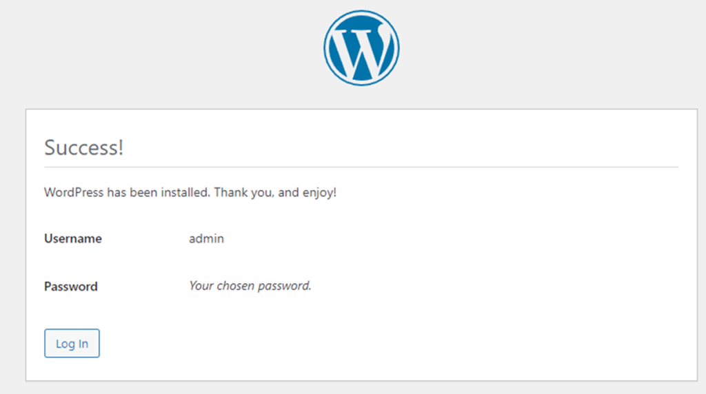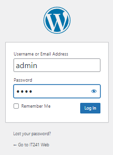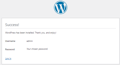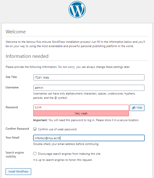 ขั้นตอนที่ 14: ตั้งชื่อเว็บและรหัสผ่านของ Admin จากนั้นกดปุ่ม Install WoprdPress เมื่อระบบติดตั้งเสร็จจะปรากฎหน้าจอให้กดลิงค์ Log In ให้นักศึกษากรอกรหัสที่ตั้งไว้ Username: admin และ Password: 1234