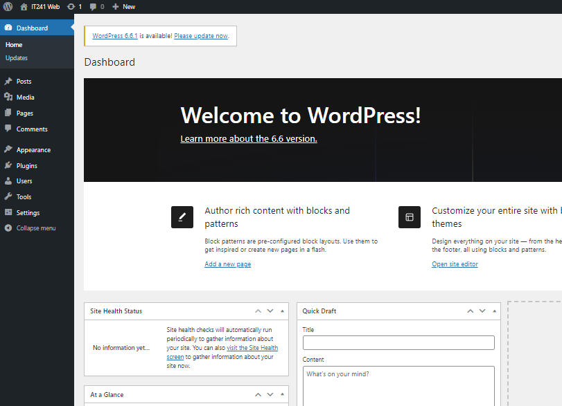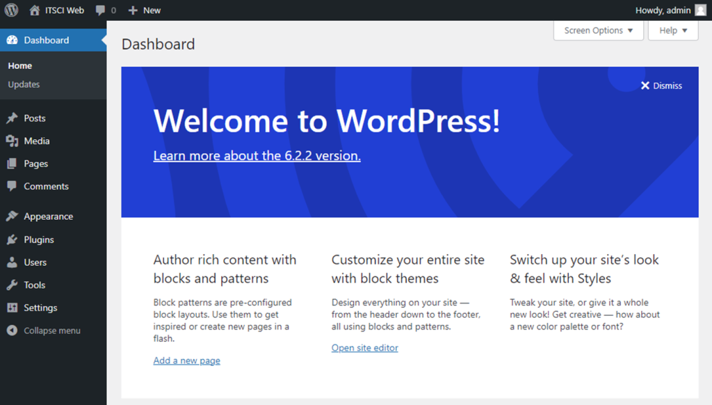 เมื่อเข้าสู่หน้าเว็บด้วยผู้ใช้ที่เป็น Admin จะมีรายการเมนูให้สร้าง post, page, media, user, และเครื่องมือต่าง ๆ
