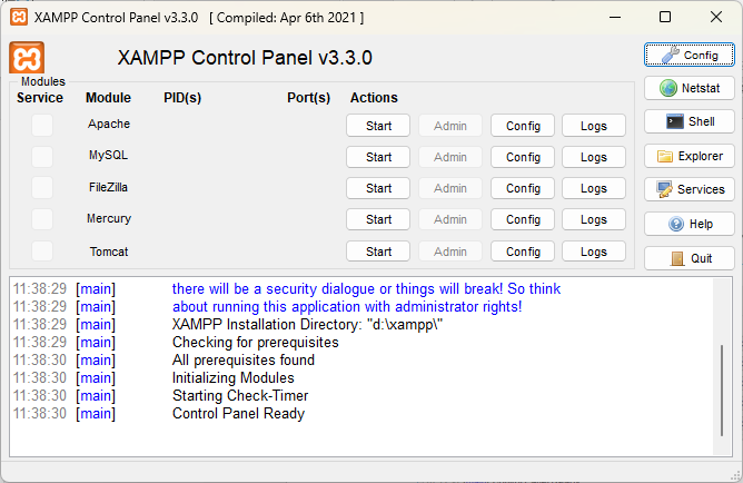 ขั้นตอนที่ 5: เปิดโปรแกรม XAMPP จาก Control Panel Application โดยไปที่ directory ที่นักศึกษาติดตั้งโปรแกรมไว้ เช่น D:\xampp จากนั้นเรียกใช้คำสั่ง xampp-control