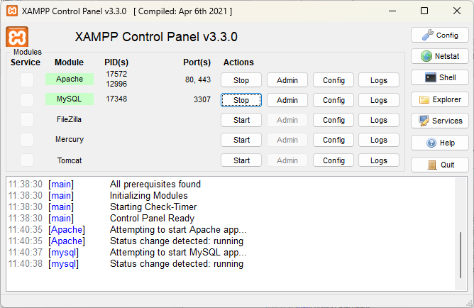 ขั้นตอนที่ 6: Start Apache, MySQL services โดยกดปุ่ม start