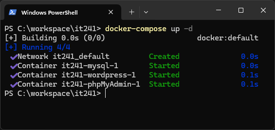 ขั้นตอนที่ 4. รันและทดสอบ Docker services ด้วยคำสั่ง docker-compose up -d ดังแสดงต่อไปนี้ (รอประมาณ 1-2 นาทีเพื่อให้ wordpress โหลดและติดตั้งค่าง ๆ)