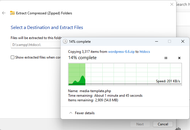 ขั้นตอนที่ 10: ดาวน์โหลด WordPress จากลิงค์ https://itsci.mju.ac.th/~watcharin/downloads/it241/wordpress-6.6.zip หรือนักศึกษาอาจดาวน์โหลดจาก Official Site ได้ https://wordpress.org/download/ จากนั้นแตกไฟล์ไว้ใน directory ที่ติดตั้งโปรแกรม xampp เช่น D:\xampp\htdocs แต่ก่อนคัดลอกให้ลบไฟล์ต่าง ๆ ใน D:\xampp\htdocs ก่อน (นักศึกษาอาจ backup โดยคัดลอกไปเก็บไว้ที่อื่นก่อนได้) หลังจากแตกไฟล์ wordpress-6.6.zip แล้วดังแสดงในรูป
