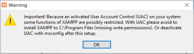 ขั้นตอนที่ 3: จากนั้นไปที่ไฟล์ติดตั้งทำการ ติดตั้งโปรแกรม กด OK เมื่อระบบมีการแจ้งเตือนเรื่องของการกำหนดสิทธิ์การใช้งานระบบกับการติดตั้งโปรแกรม XAMPP เพื่อป้องกันปัญหานักศึกษาอาจติดตั้งไปยังไดร์อื่นนอ่กจากไดร์ C เช่น D หรือ E เป็นต้น